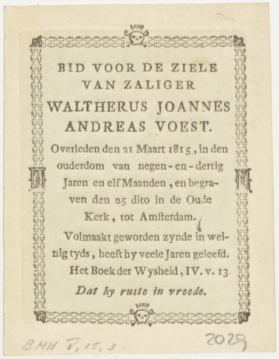 Het leven der Heilige Maagd Maria (serie): 12. Vlucht naar Egypte, kz. Bid voor ziel Waltherus Joannes Andreas Voest (+1815);Oude Kerk;Amsterdam;