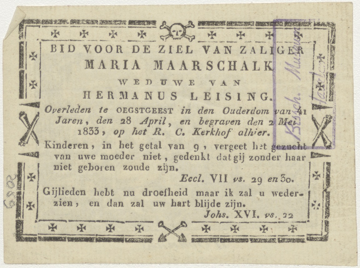 H. Joannes (Johannes), kz. Bid voor ziel Leising-Maarschalk (+1833);Oegstgeest;