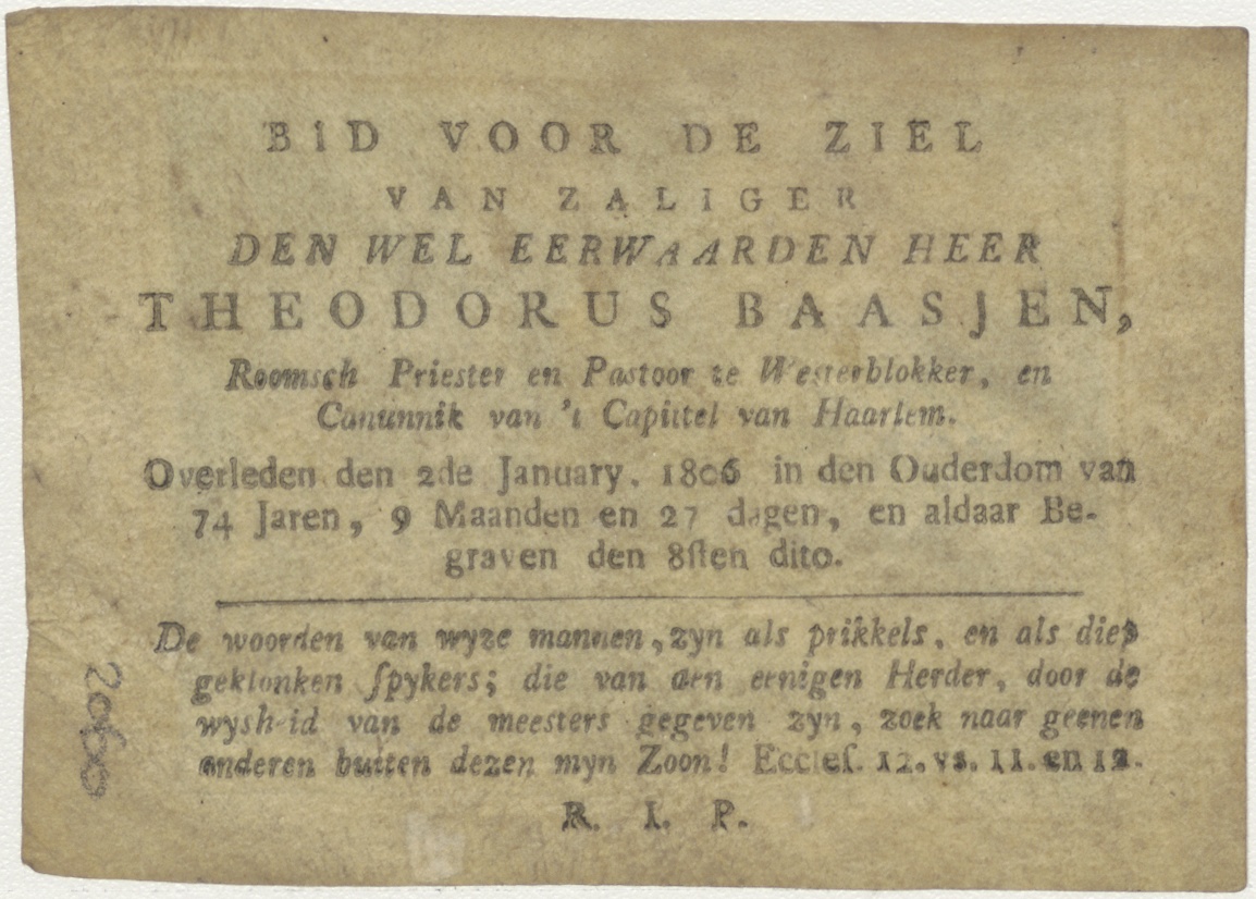 H. Matteus (Mattheus), kz. Religieus;Bid voor ziel Theodorus Baasjen (+1806);pastoor te Westerblokker;kapittel Haarlem;