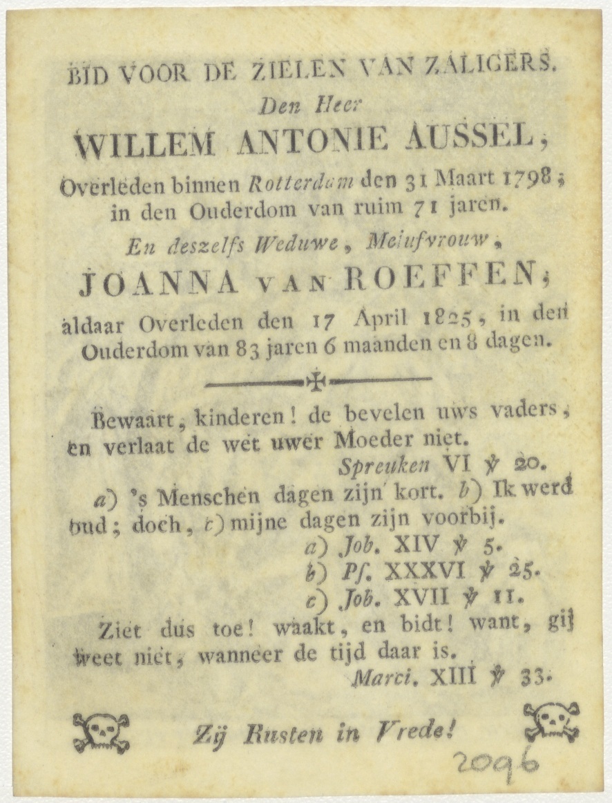 Kruisafneming: Christus wordt van het kruis gehaald, kz. Bid voor ziel Roeffen-Aussel (+1825);Rotterdam;