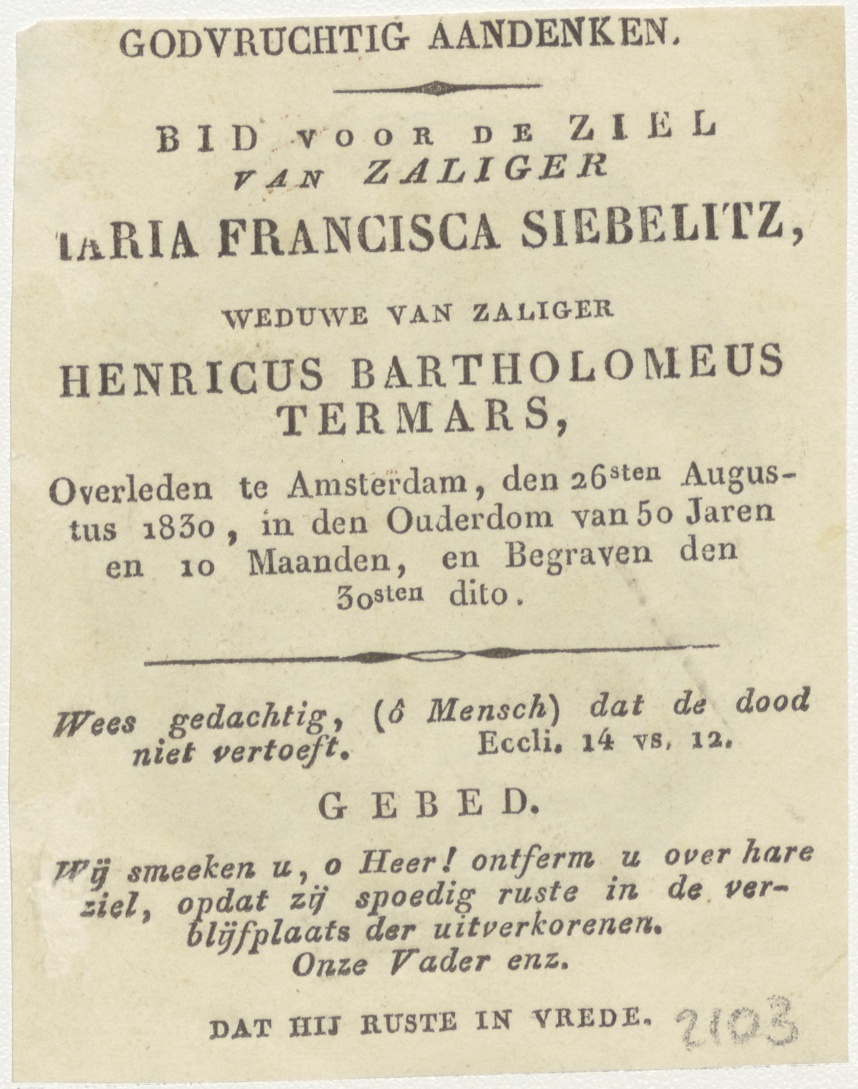 Geboorte van Christus, kz. Bid voor ziel Termars-Siebelitz (+1830);Amsterdam;