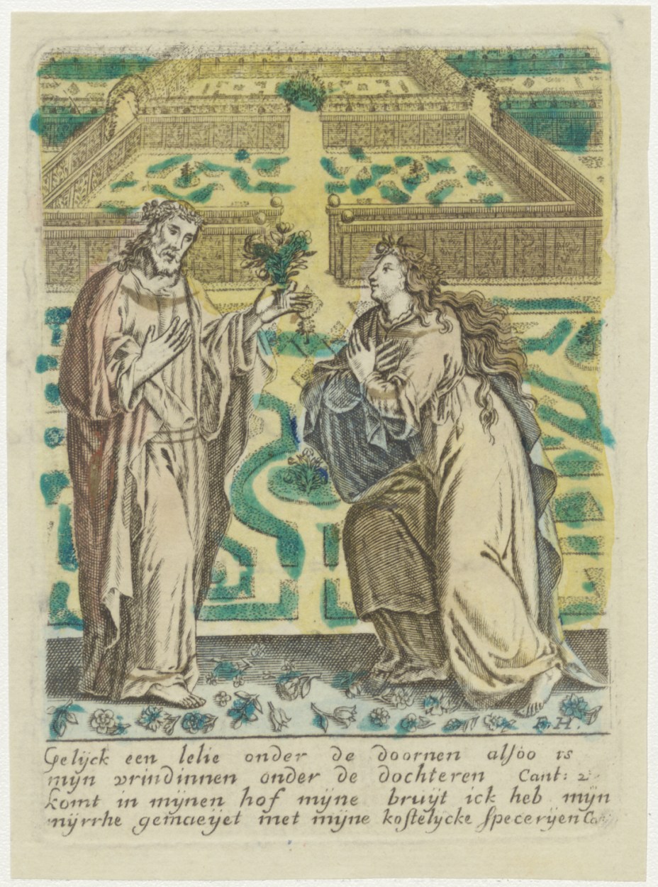 Christus als hovenier met vrouw, ingekleurd, kz. Beloning van Klunter van pastoor G. van Lieshout te Langeraar;1835;