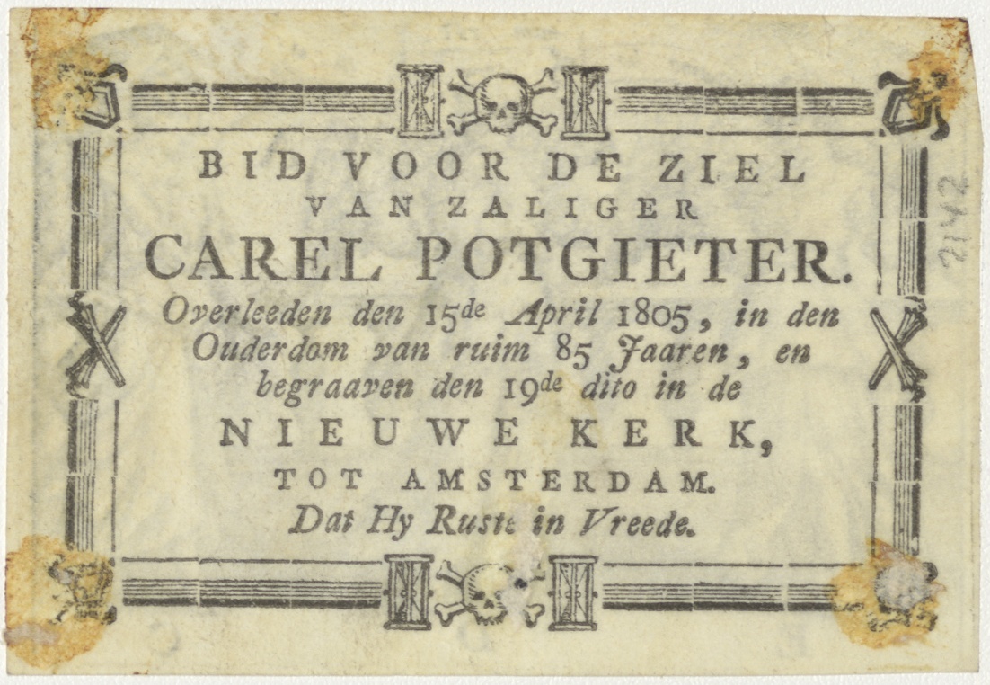 Drie engelen, kz. Bid voor ziel Potgieter (+1805);Nieuwe Kerk Amsterdam;