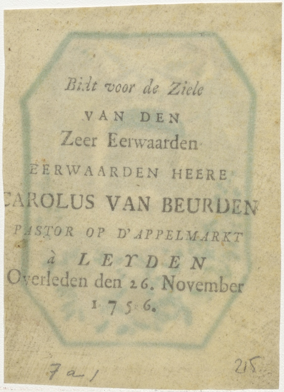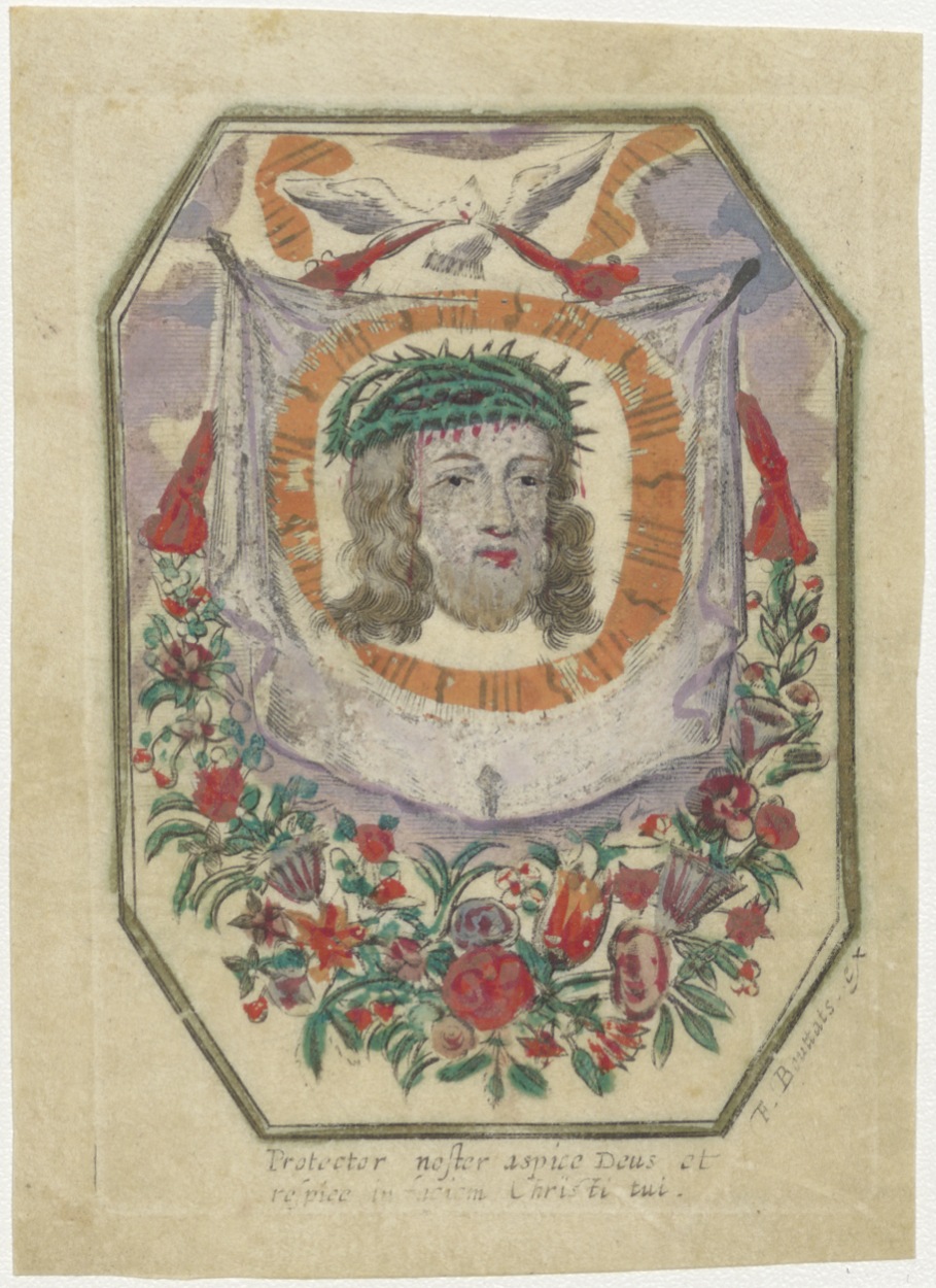 Veronicadoek, hoofd van Christus, ingekleurd, kz. Religieus;Bid voor ziel Carolus van Beurden (+1756), pastor op d'Appelmarkt te Leiden