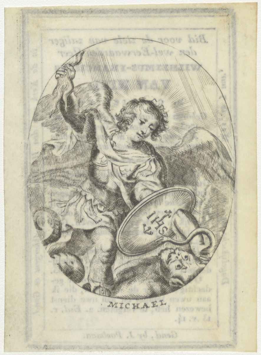 H. Michael verslaat de draak (duivel), kz. Religieus;Bid voor ziel Wilhelmus van Niel (+1829);pastoor te Gend;
