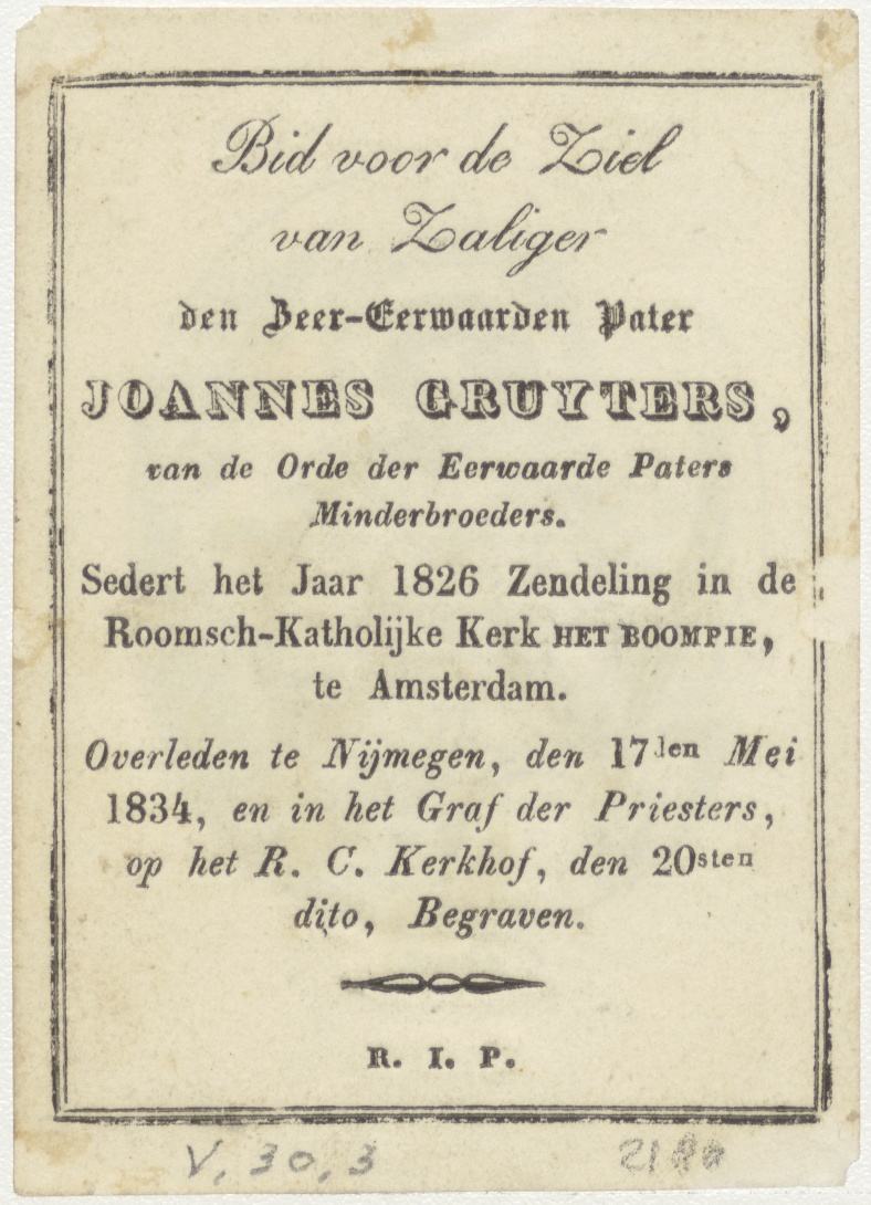 H. Agnes, kz. Religieus;Bid voor ziel Joannes Gruyters (+1826);zendeling bij het Boompje;Amsterdam;