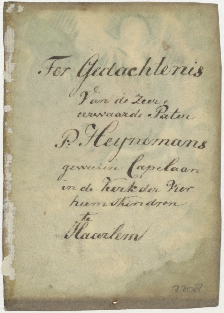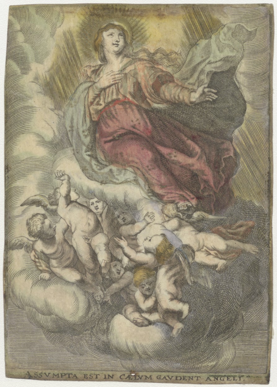 Hemelvaart van Maria, ingekleurd, kz. Religieus;Ter gedachtenis van P. Heijnemans, geweezen kapelaan in kerk der vier Heemskinderen te Haarlem
