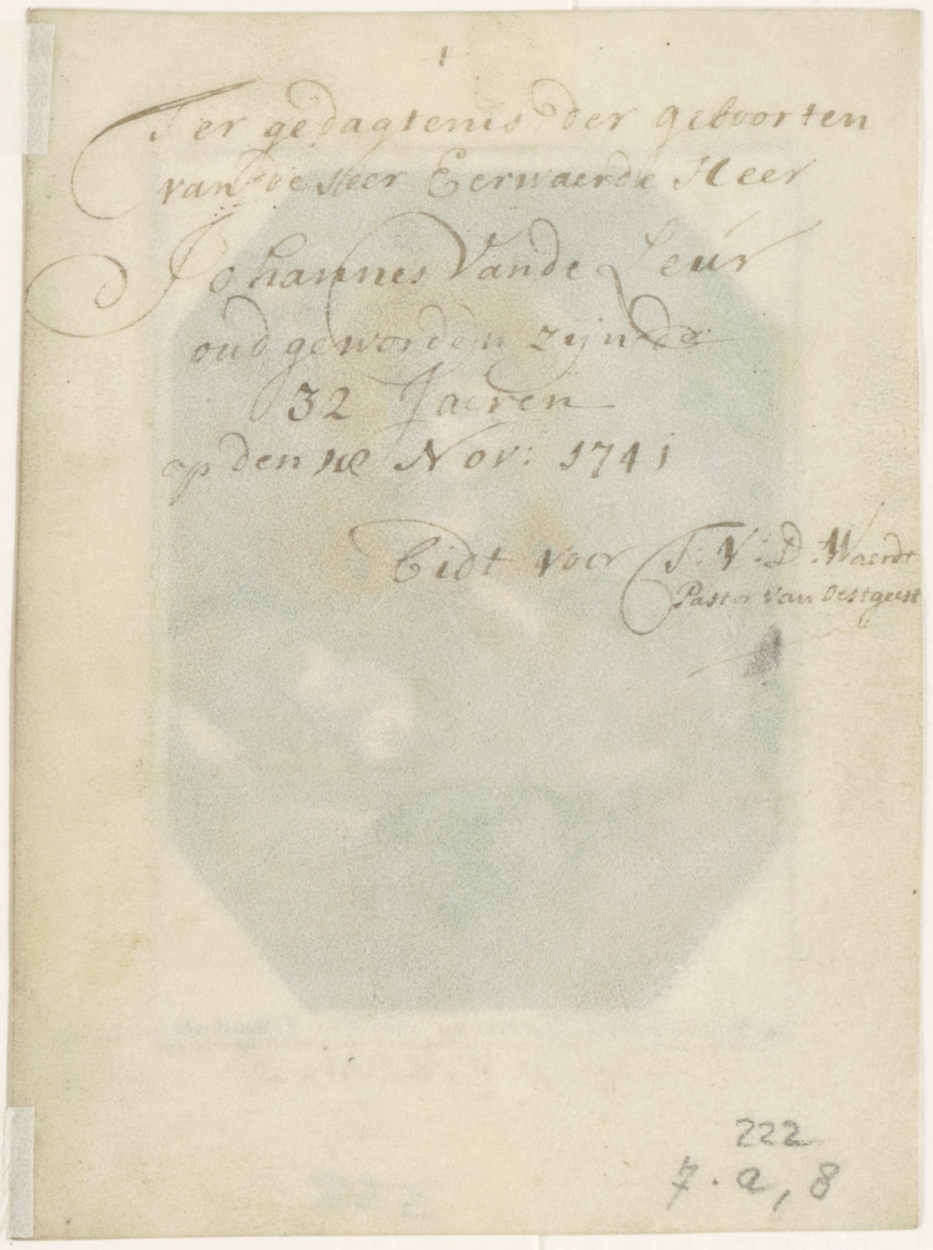 Aanbidding der herders, ingekleurd, kz. Religieus;Ter gedachtenis der geboorten Johannes van de Leur, oud geworden zijnde 32 jaren (1741), bid voor T. v.d. Waerdt, pastor van Oegstgeest