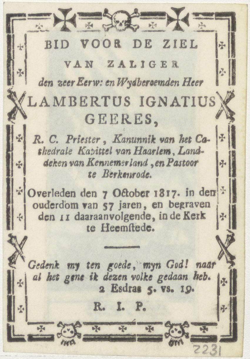Franciscus Xaverius, kz. Religieus;Bid voor ziel Lambertus Geeres (+1817);pastoor Berkenrode;kanunnik;Haarlem;etc.;