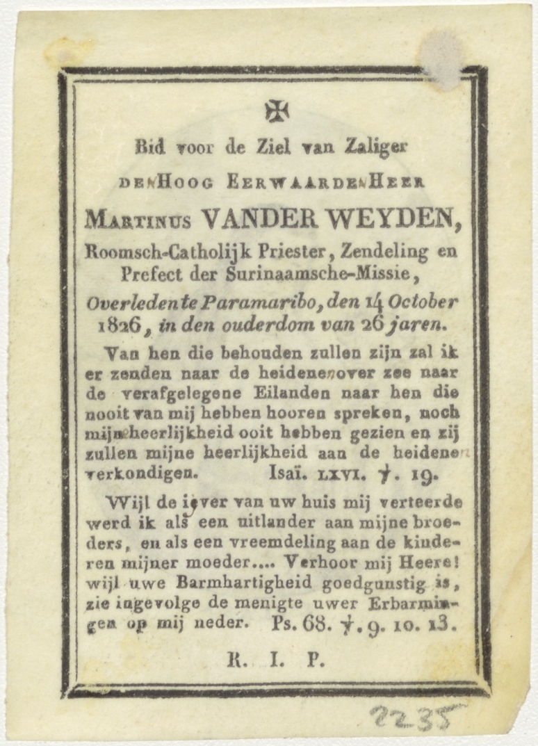 H. Clara, kz. Religieus;Bid voor ziel Martinus van der Weyden (+1826);priester perfect Surinaamsche missie;