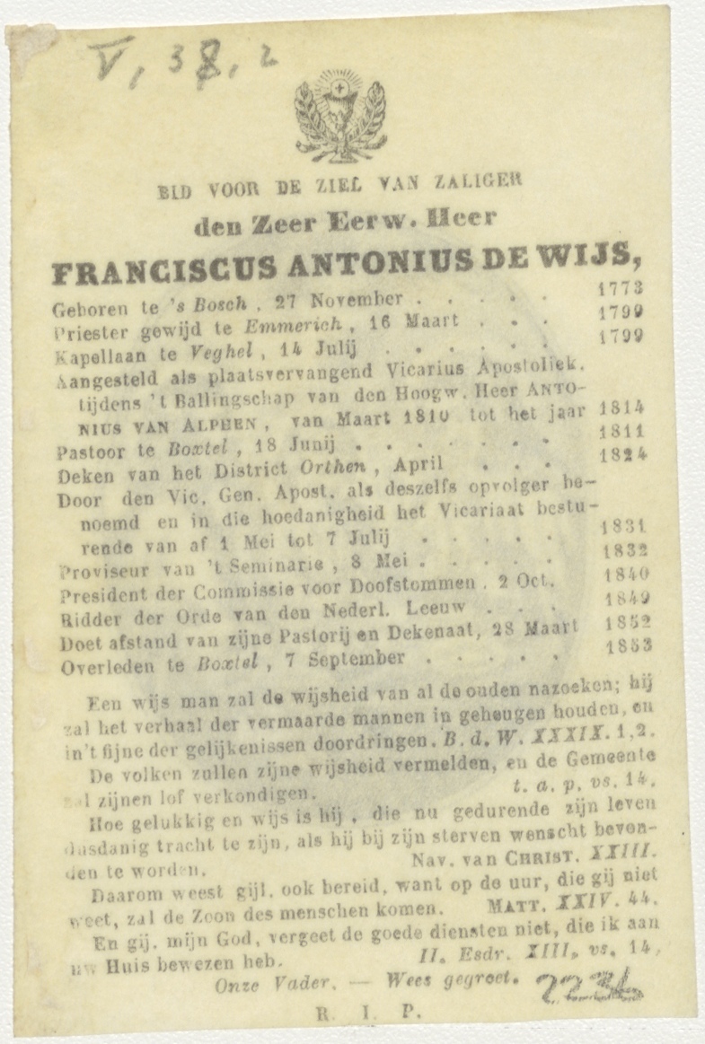 H. Familie aan tafel, kz. Religieus;Bid voor ziel Franciscus de Wijs (+1853);pastoor te Boxtel;