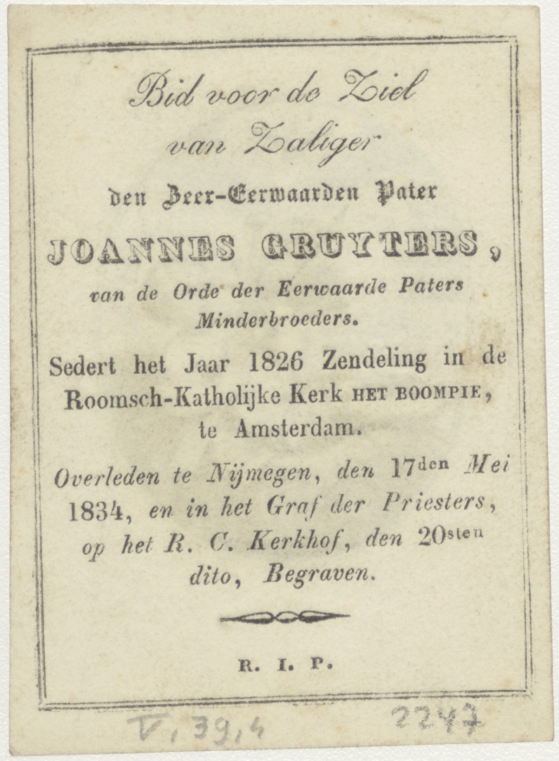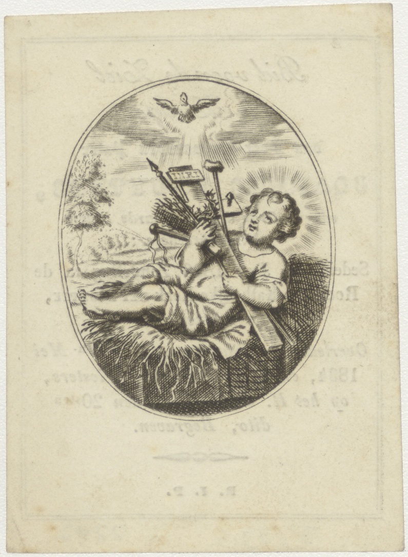 Christuskind met passiewerktuigen, kz. Religieus;Bid voor ziel Fruyters (+1826);het Boompje;Amsterdam;