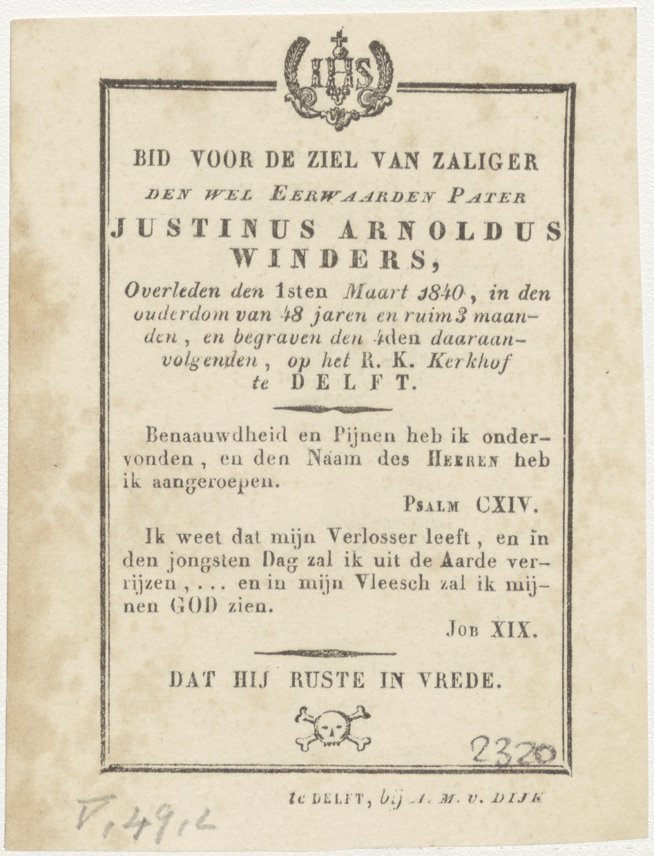 H. Vincentius, kz. Religieus;Bid voor ziel Justinus Winders (+1840);Delft;