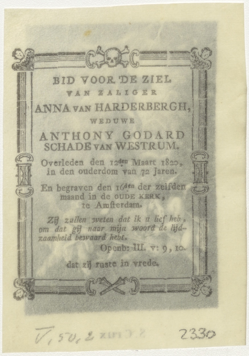 H. Kruis (Frans), kz. Bid voor ziel Hardenbergh-Schade van Wesrtum (+1820);Oude Kerk;Amsterdam;