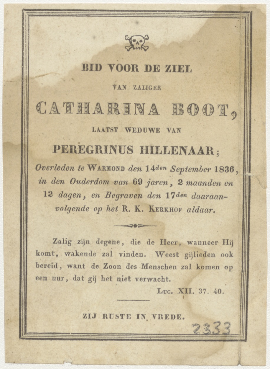 H. Zoé, kz. Bid voor ziel Catharina Hillenaar-Boot (+1836);Warmond;
