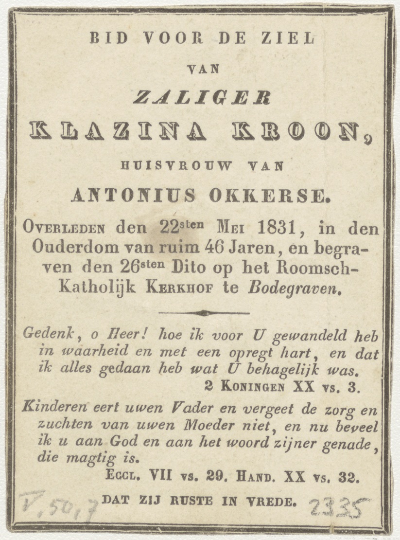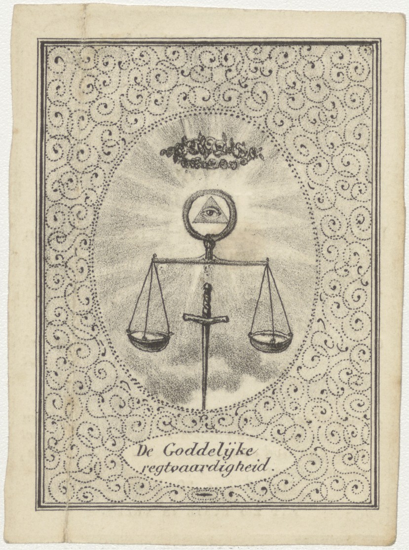 Goddelijke regtvaardigheid, alziend oog met weegschaal, kz. Bid voor ziel Oukerse-Kroon (+1831);Bodegraven;