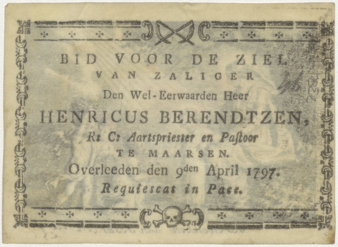 Geschenken aan Jezus, Christus, kz. Religieus;Bid voor ziel Henricus Berendtzen (+1797);pastoor;aartspriester te Maarsen;