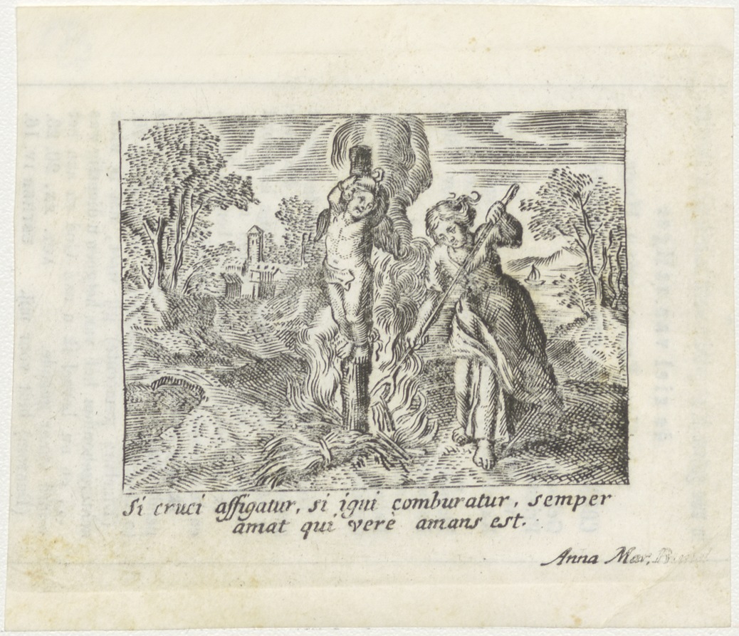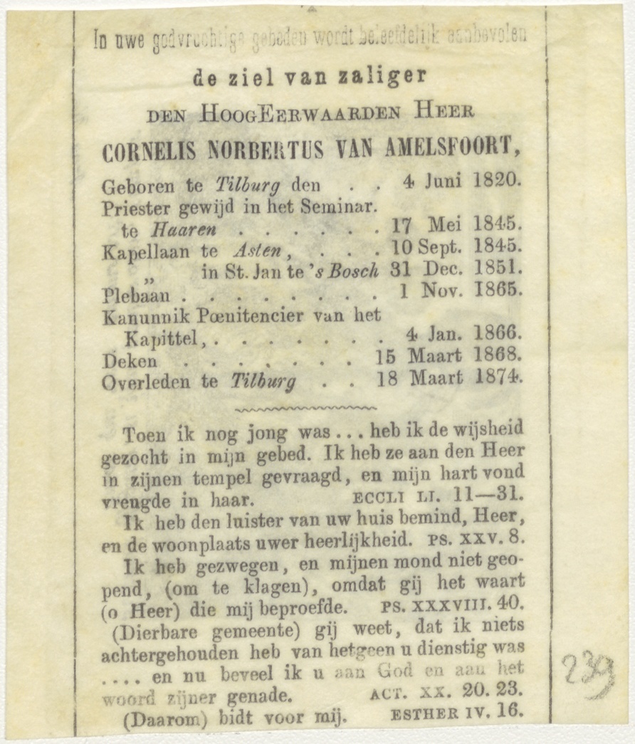 Verbranding van engel aan paal door vrouw, kz. Religieus;Bid voor ziel Cornelis N. van Amersfoort (+1874);Tilburg;kapelaan Den Bosch;
