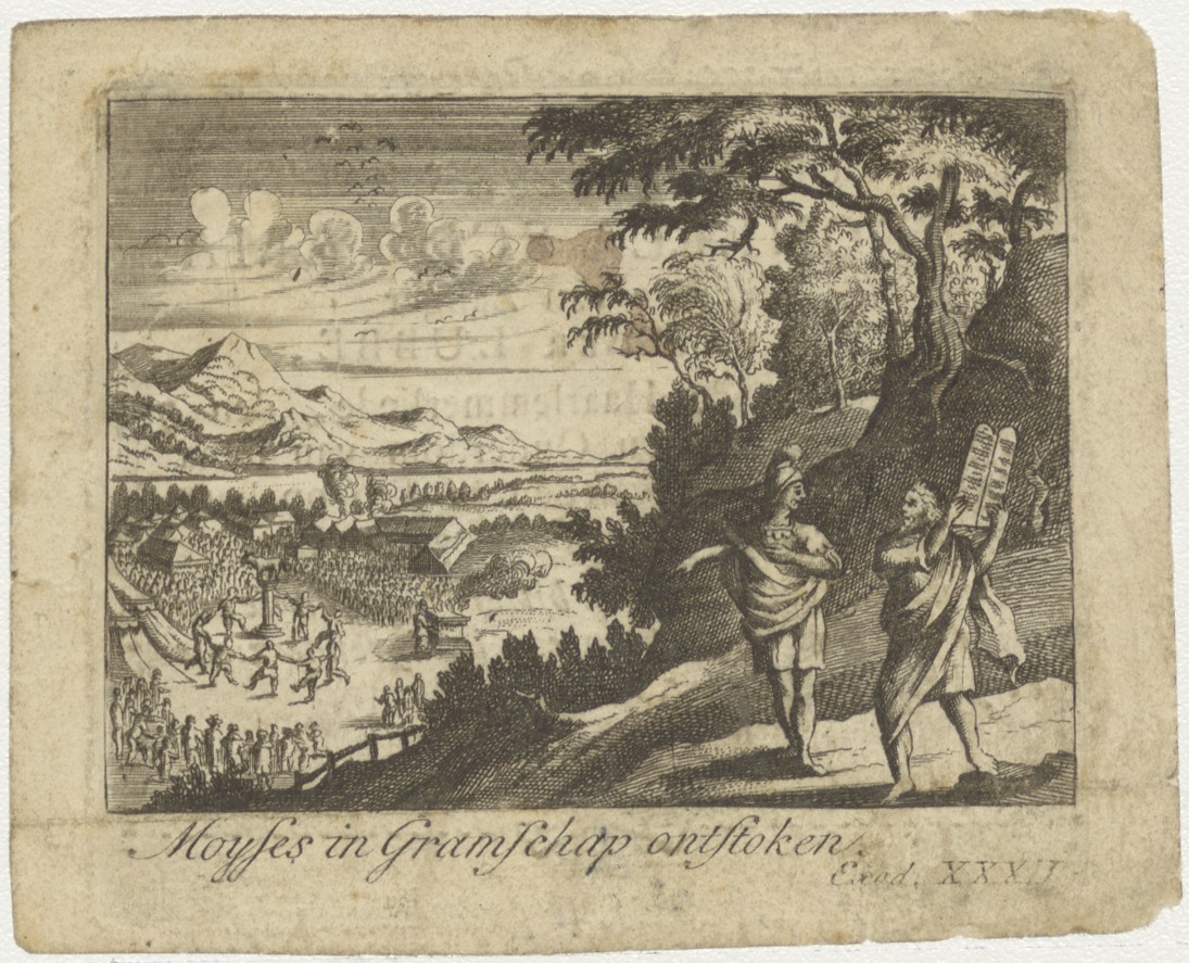 Mozes in gramschap ontstoken (Ex.22), dans rond het gouden kalf, kz. Bid voor ziel Lubbe-Schrama (+1825);Haarlemmerliede;