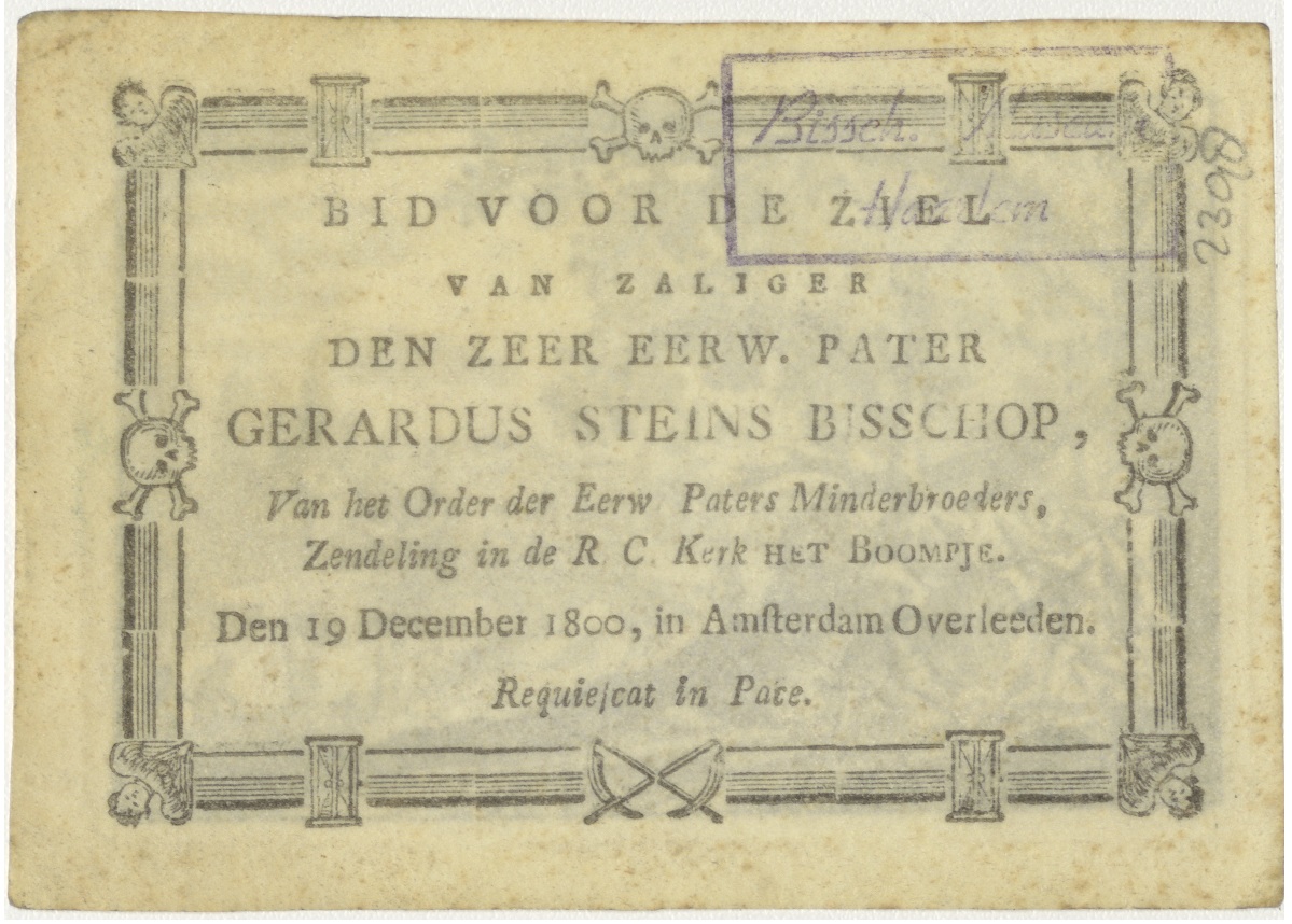 Land van beloften (Num.13), kz. Religieus;Bid voor ziel Gerardus Steins bisschop (+1800);R.K. kerk het Boompje;Amsterdam;