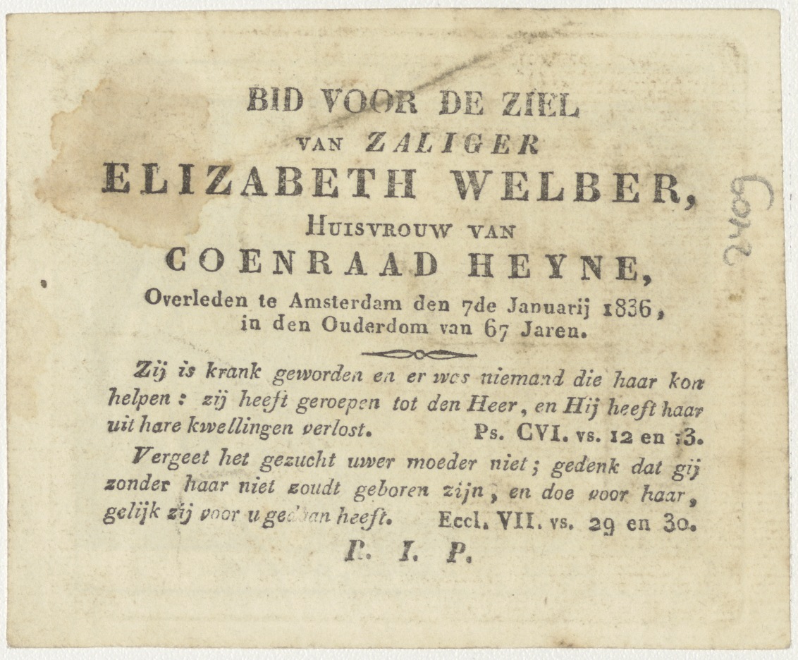 Agag in stukken gehouwen (1 Sam.32), kz. Bid voor ziel Heyne-Welber (+1836);Amsterdam;