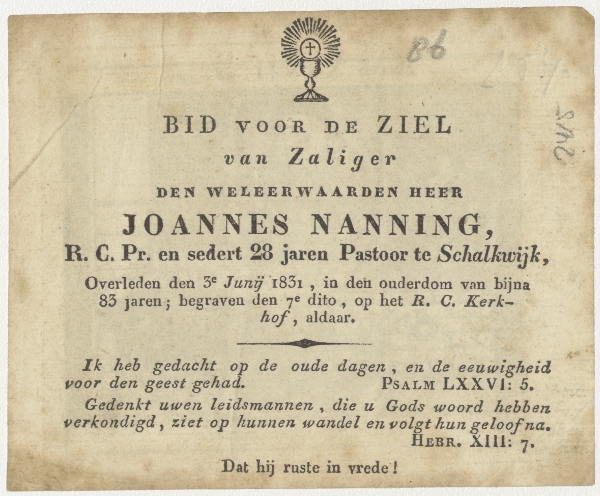 Ecce Homo Jezus (Christus) ten toon gesteld (Mat.27:28), kz. Religieus;Bid voor ziel Joannes Nanning (+1831);pastoor te Schalkwijk;