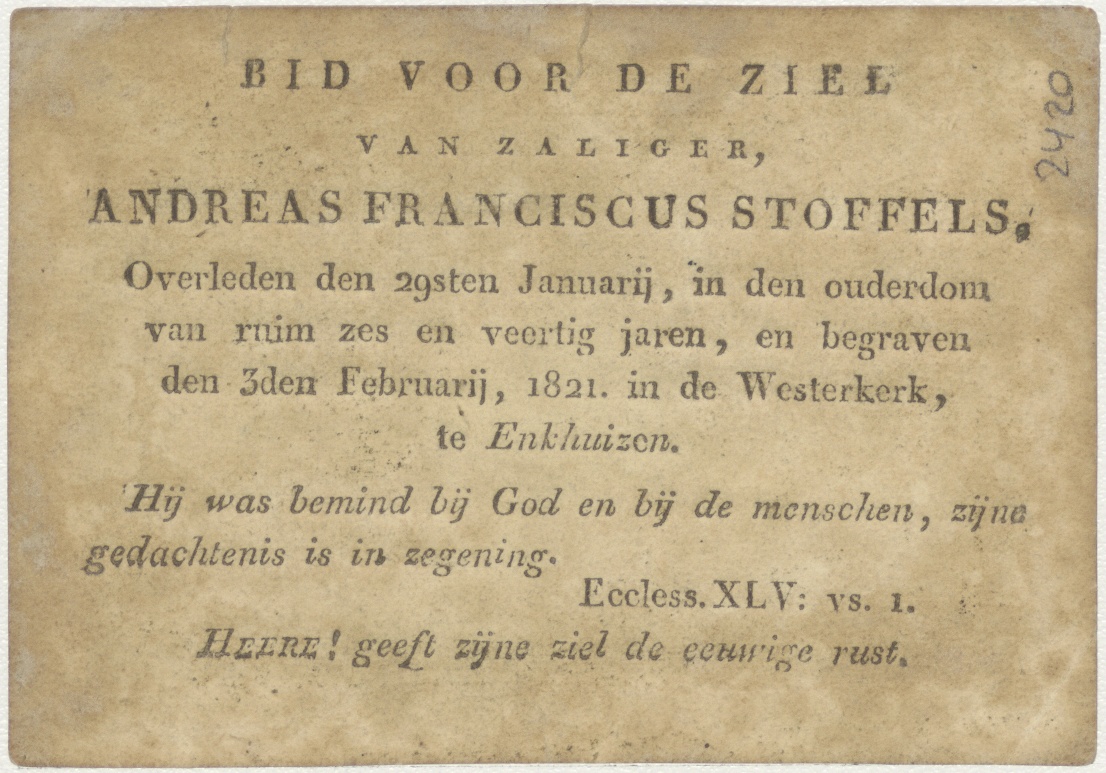 Gebed van Manasse in de gevangenis (Kon.), kz. Bid voor ziel Stoffels (+1821) Enkhuizen