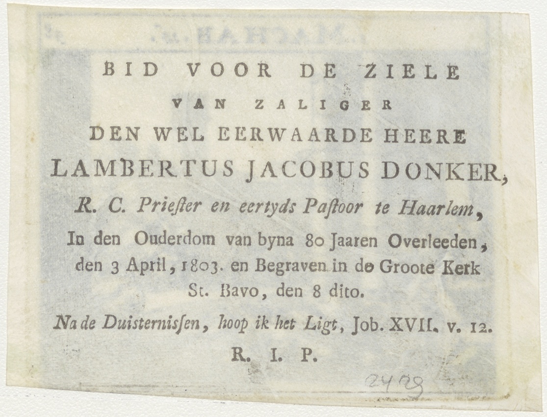 (1 Machab.16) Simson in de tempel(?), kz. Religieus;Bid voor ziel Lambertus Donker (+1803);pastoor te Haarlem;