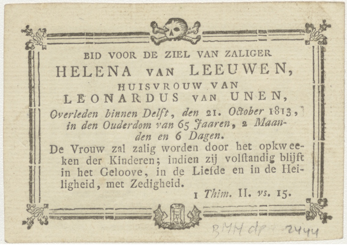 Daar was voor hen geen plaats in de herberg (Luc.11:7), H. Familie, kz. Bid voor ziel Van Leeuwen-Van Unen (+1813);Delft;