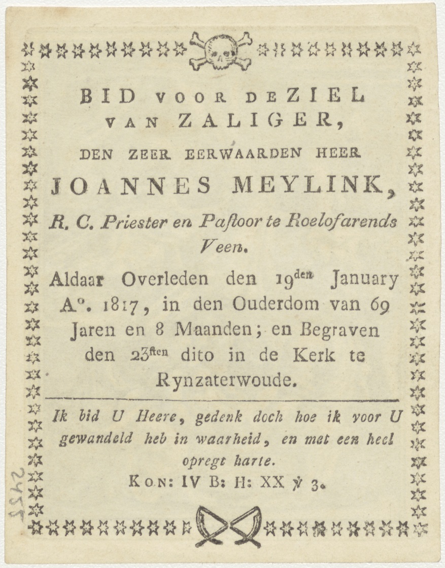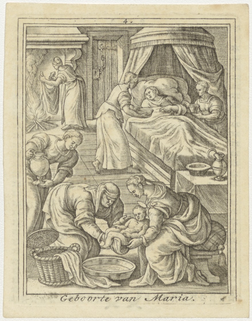 Het leven der Heilige Maagd Maria (serie): 4. Geboorte van Maria, kz. Religieus;Bid voor ziel Joannes Meylink (+1817), pastoor te Roelofarendsveen