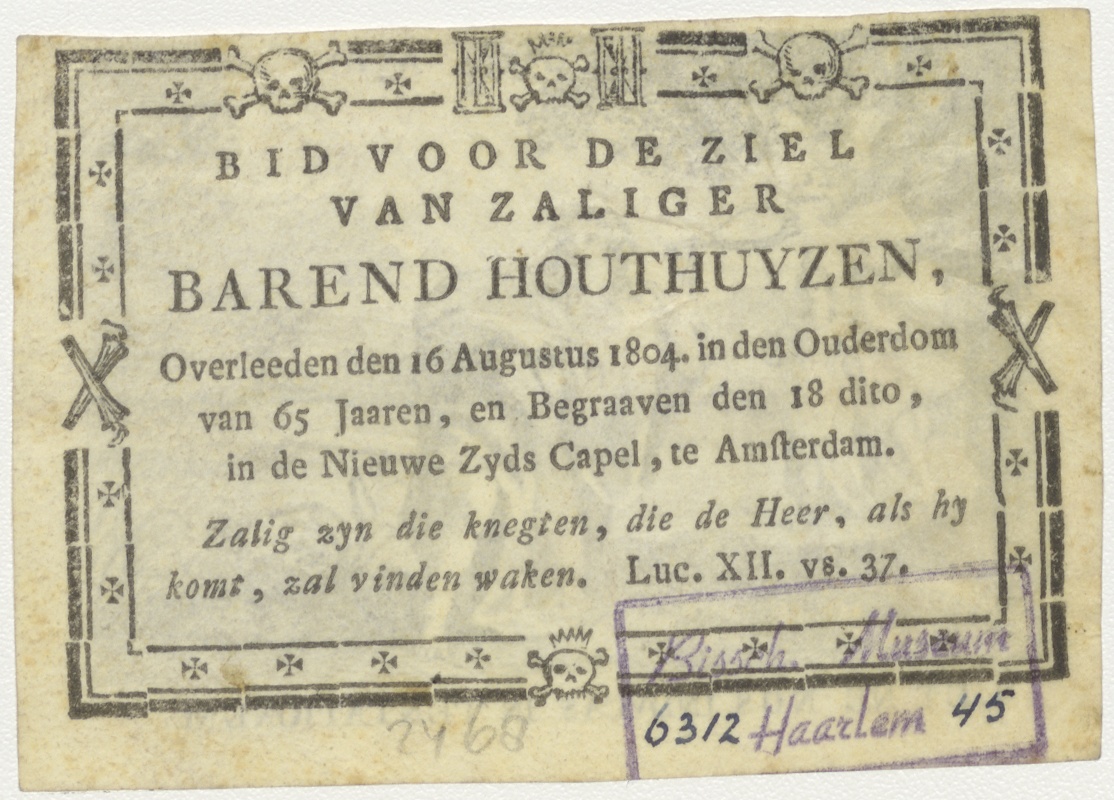 Et ne nos inducas in tentationem, En leidt ons niet in bekoring, kz. Bid voor ziel Houthuyzen (+1804);Amsterdam;