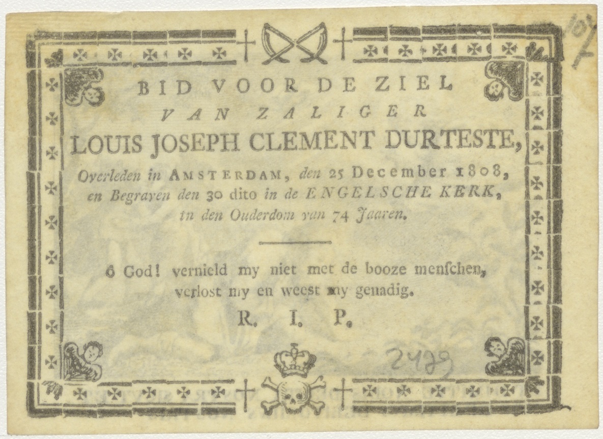 Et dimitte nobis... Lijd ons niet in bekoring, met God de Vader, kz. Bid voor ziel Durtaste (+1808);Engelsche Kerk;Amsterdam;
