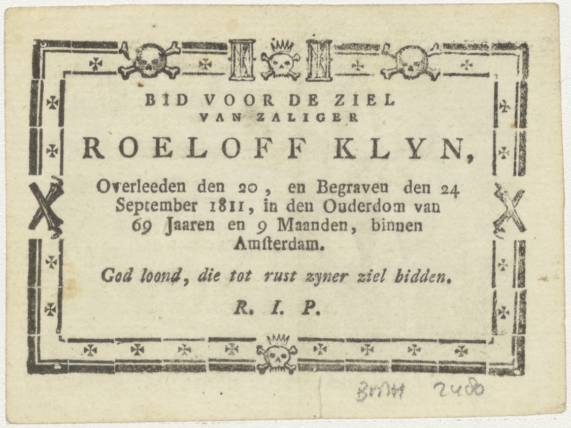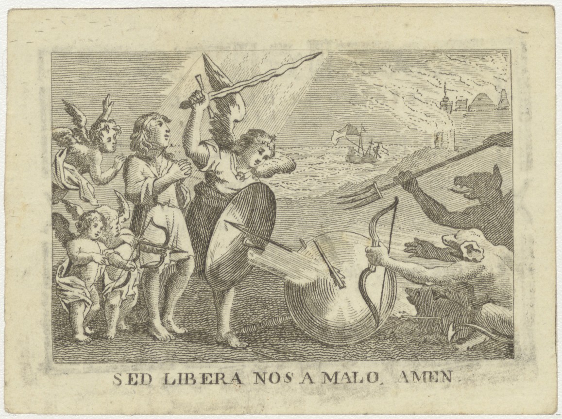 Sed Libera nos a malo, Amen. Verlos ons van het kwade (duivels), kz. Bid voor ziel Roeloff Klyn (+1811), Amsterdam