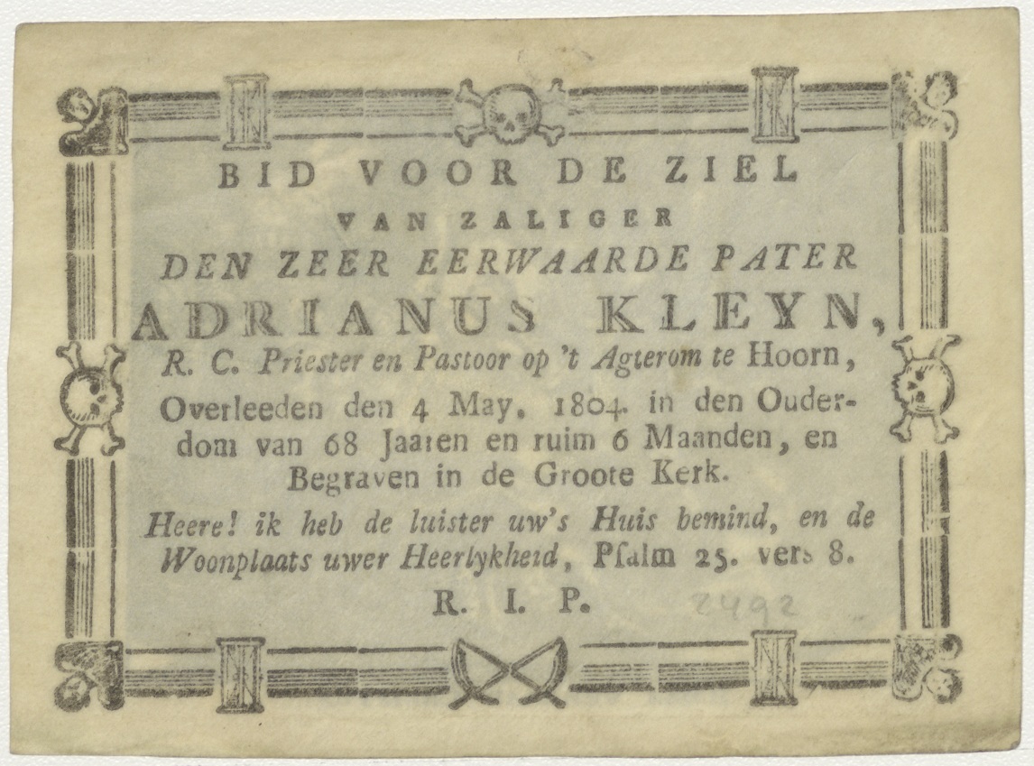 Judas verraadt Christus, kz. Religieus;Bid voor ziel Adrianus Kleyn (+1804);pastoor 't Agterom;Hoorn;
