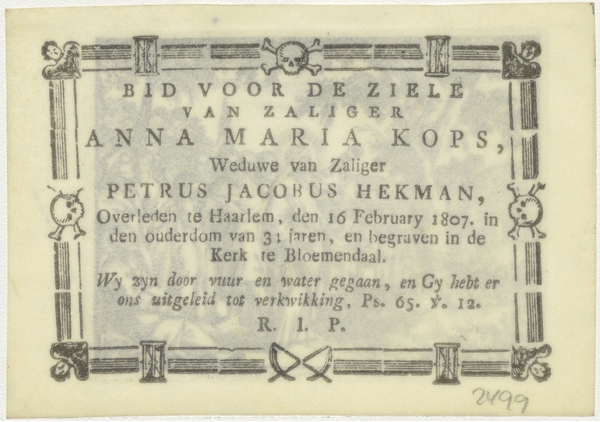 Zacheus op den vijgenboom met Christus, kz. Bid voor ziel Hekman-Kops (+1807);Bloemendaal;