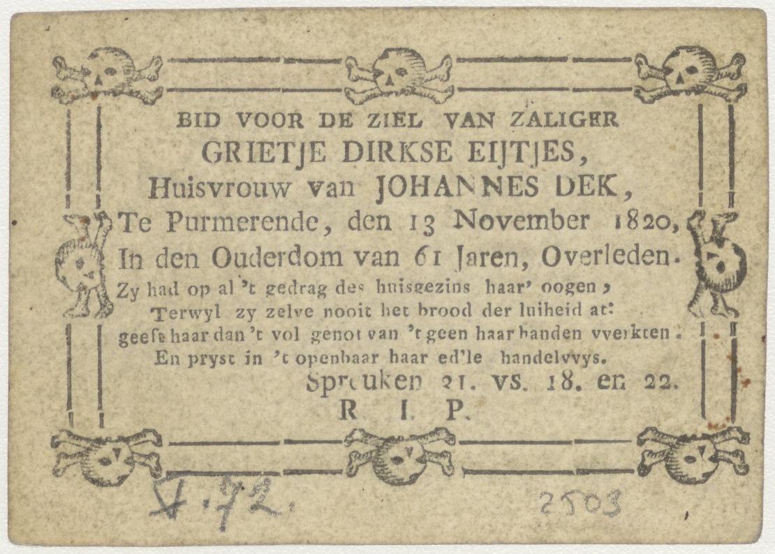 Geboorte van den Zaligmaker (Luc.2:7), geboorte van Christus, kz. Bid voor ziel Dek. Eijtjes (+1820);Purmerend;