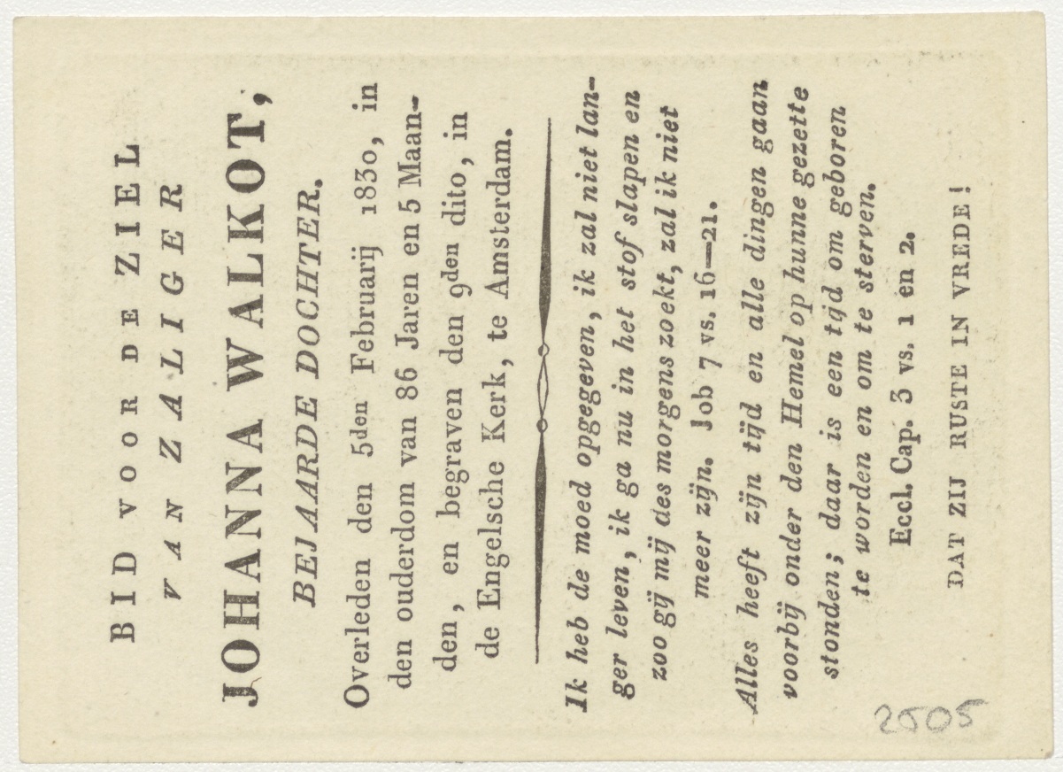 Vas insigne devotiones: Maria(?), kz. Religieus;Bid voor ziel Johanna Walkot (+1830);Bejaarde dochter Engelsche Kerk;Amsterdam;