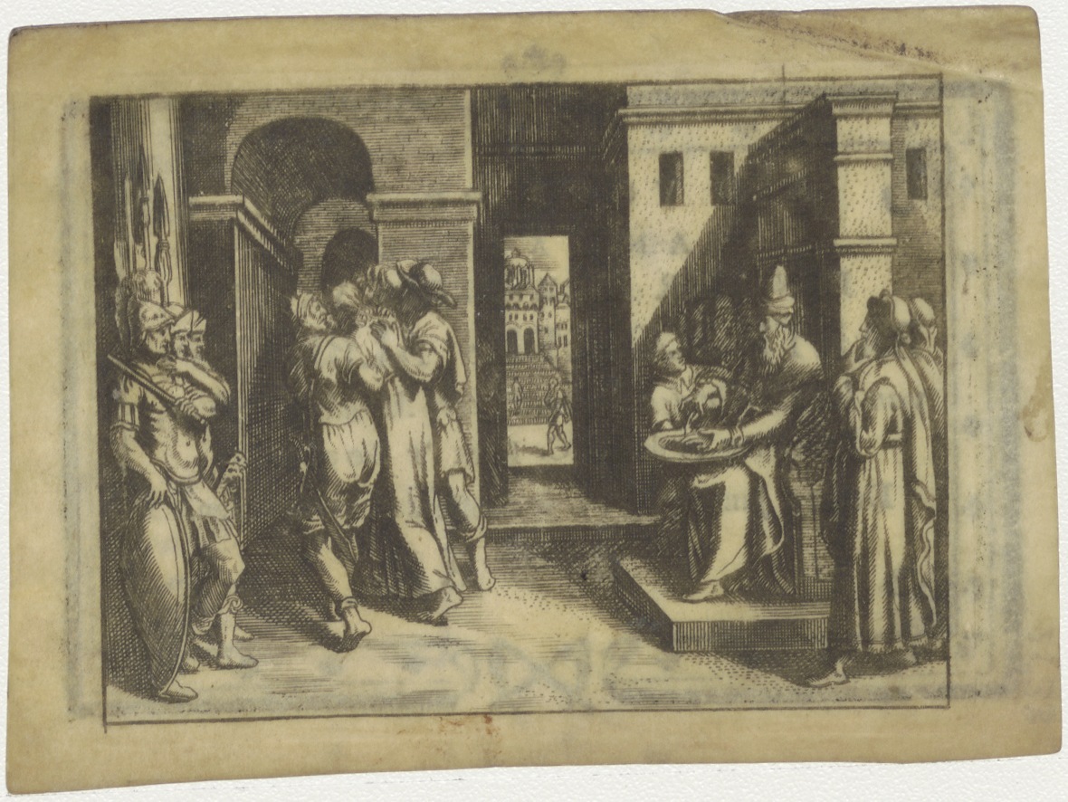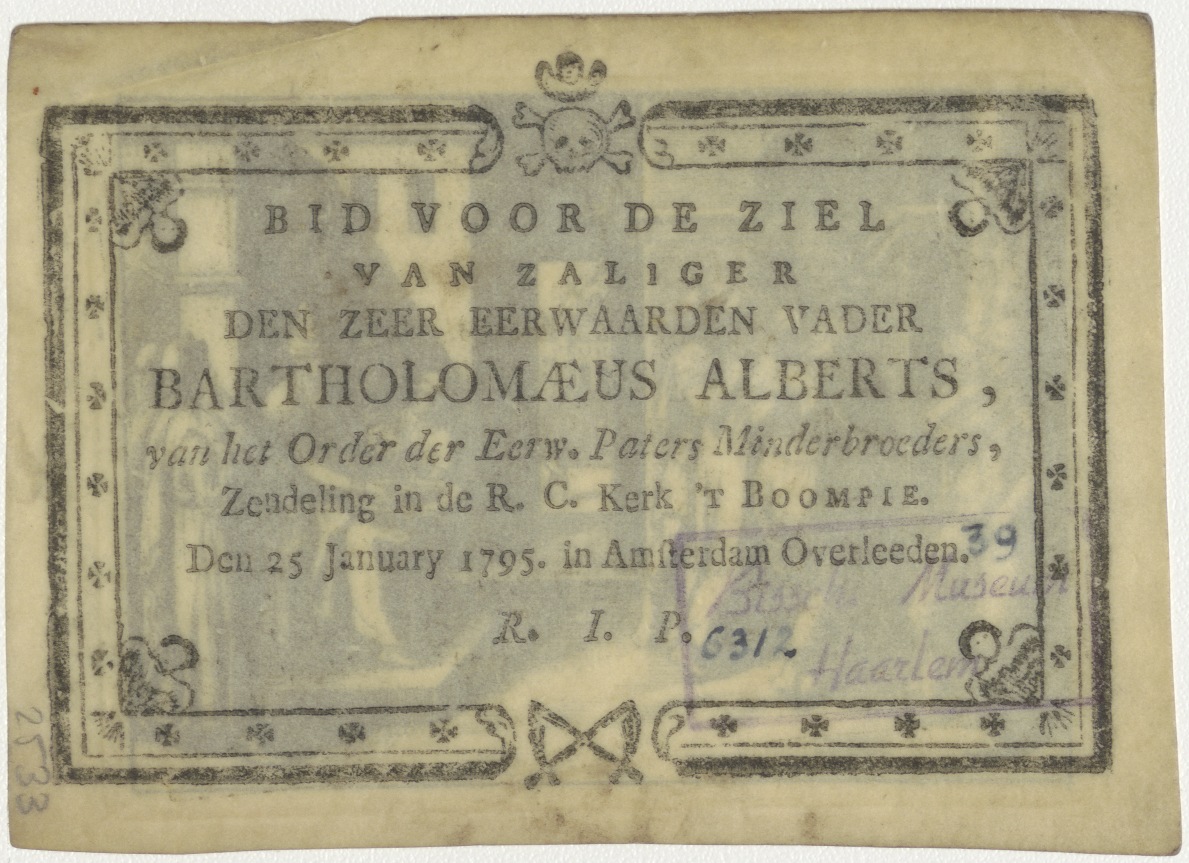 Passiescène: Christus wordt weggevoerd, Pilatus wast zijn handen, kz. Religieus;Bid voor ziel Bartholomaeus Alberts (+1795);Minderbroeder;'t Boompje;Amsterdam;