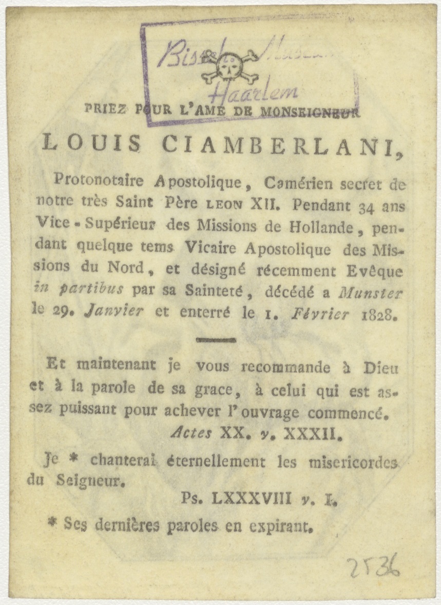 Christuskind met passiewerktuigen, kz. Bid voor ziel Louis Ciamberlani (+1828);vice-superieur;Hollandsche zending;Munster;