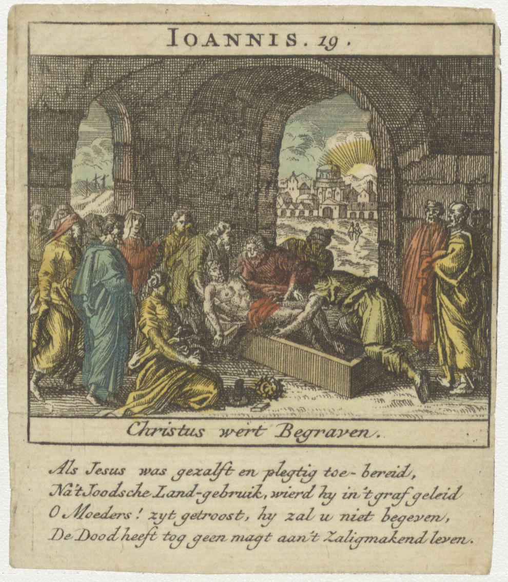 Passiescène: Christus wert begraven (Joh.19), ingekleurd, kz. Religieus;Bid voor ziel Andreas Anink (+1809);pastoor Agterom;Hoorn;