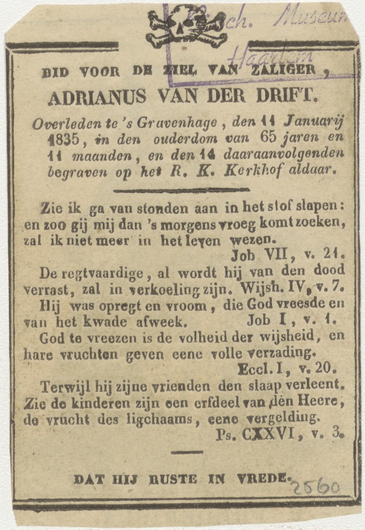 H. Fredericus, kz. Bid voor ziel Van der Drift (+1835);'s-Gravenhage;