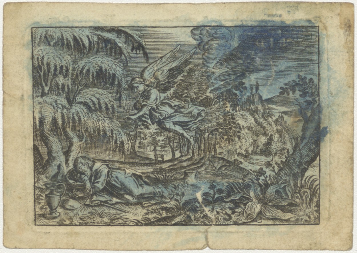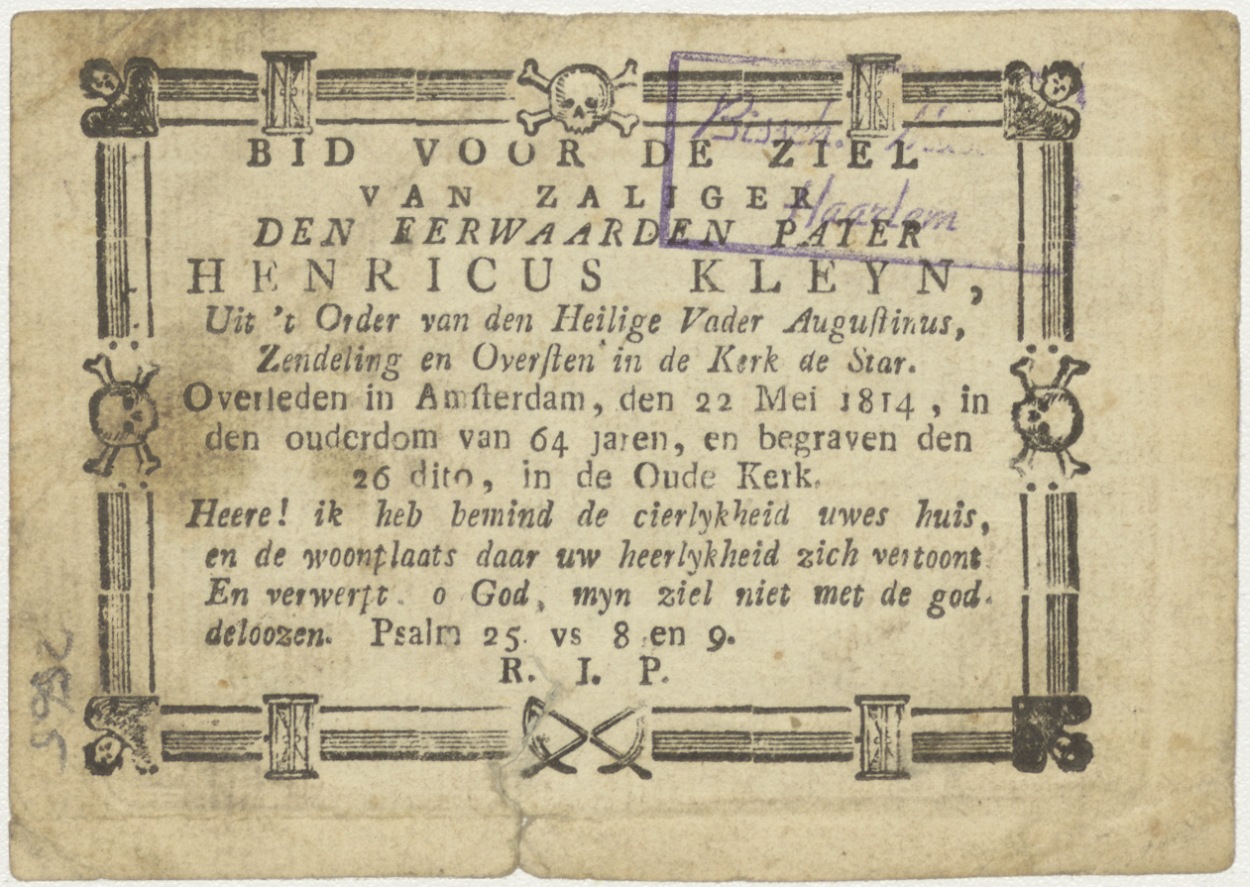 Slapende man met engel, ingekleurd, kz. Religieus;Bid voor ziel Henricus Kleyn (+1814);pastoor kerk de Star;Amsterdam;