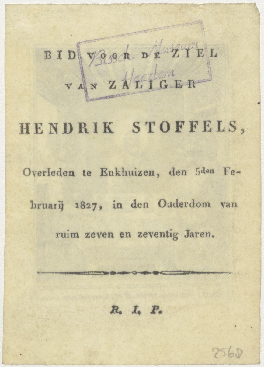 Aperti Sunt Ocoli... Christus breekt het brood bij Emmaüsgangers, kz. Bid voor ziel Stoffels (+1827);Enkhuizen;
