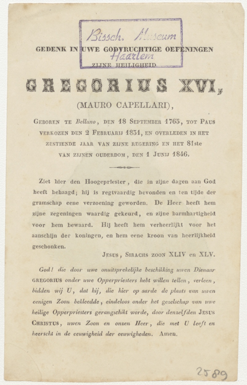 Portret van paus Gregorius XVI (1765-1846), paus vanaf 1831, kz. Gedenk paus Gregorius XVI