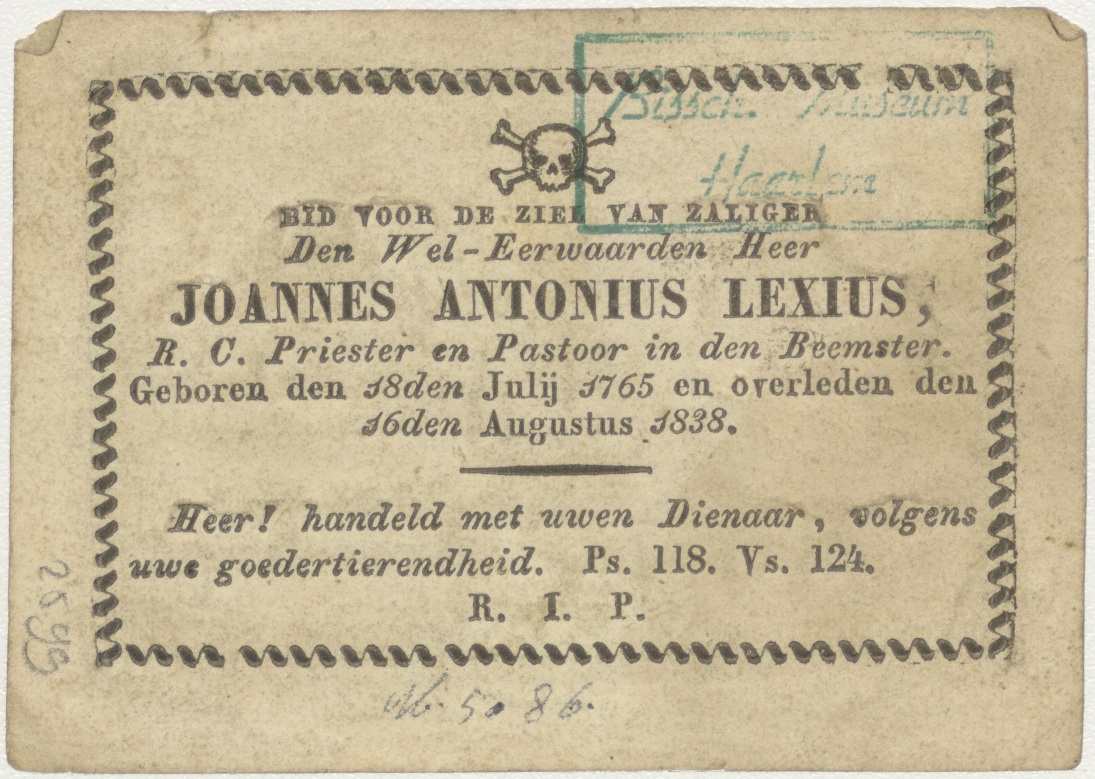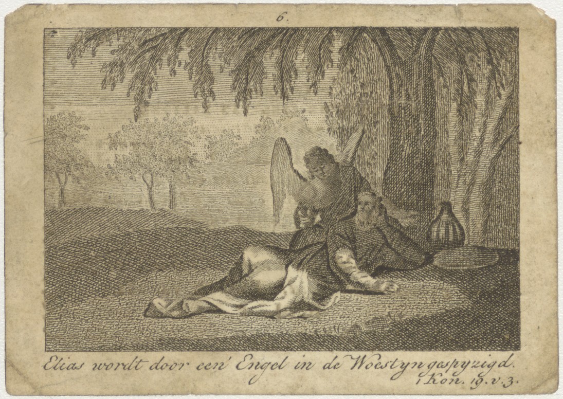 Elias wordt door een engel in de woestijn gespijzigd (1 Kon.19:3), kz. Religieus;Bid voor ziel Lexius (+1838);pastoor in den Beemster;