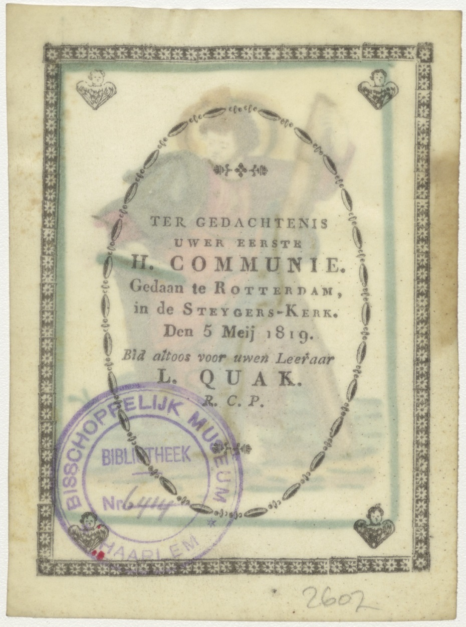 H. Andreas, ingekleurd, kz. H. Communie;1819;door L. Quak;Steyger kerk;Rotterdam;