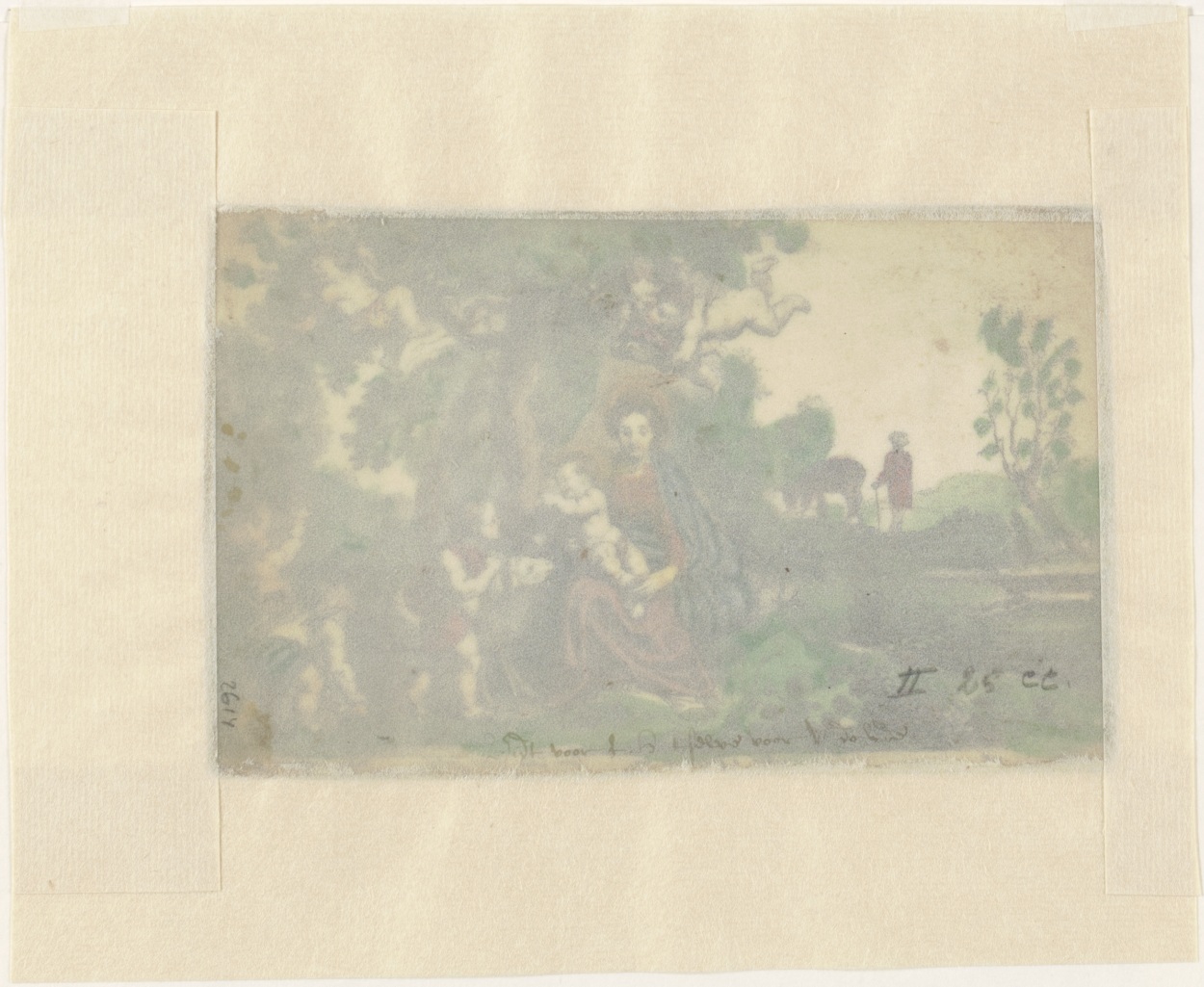 Rust op vlucht naar Egypte, ingekleurd, kz. oud schrift(?);