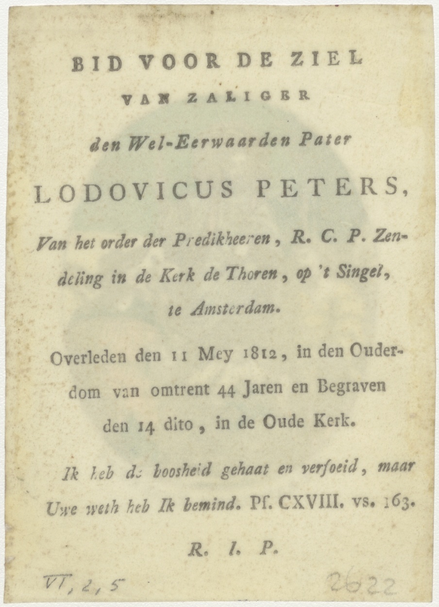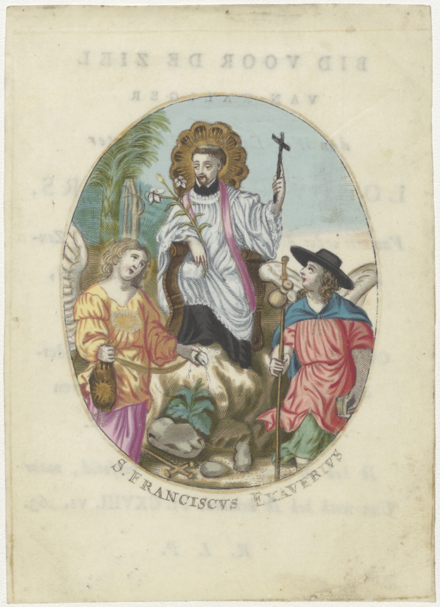 H. Franciscus Xaverius, ingekleurd, kz. Religieus;Bid voor ziel Lodovicus Peters (+1812);pastoor de Thoren op 't Singel;Amsterdam;