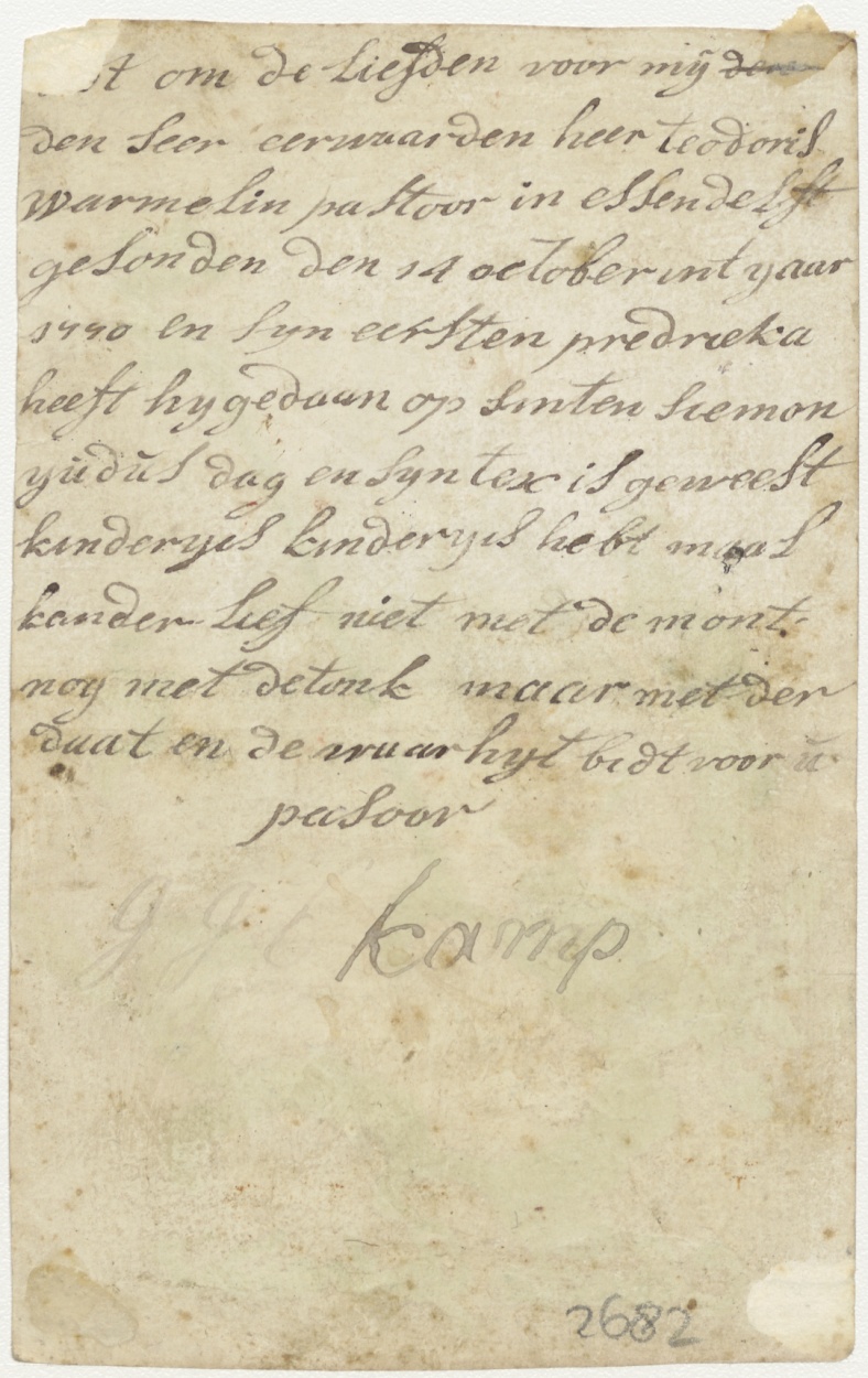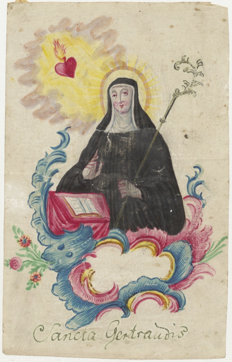 H. Gertrudis van Helfta, ingekleurd, kz. Bid voor Theodorus Warmelin, pastoor te Assendelft, eerste preek in 1770