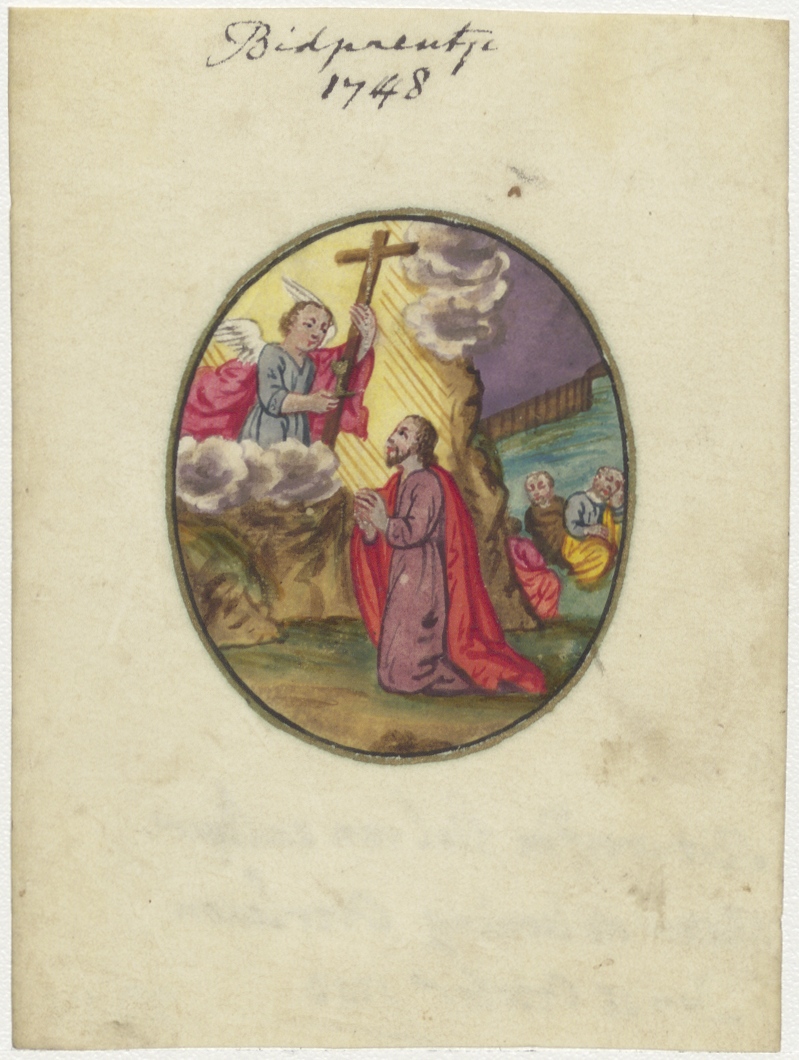 Christus in tuin van Getsemané, ingekleurd, kz. Bid voor ziel De Koning (+1743)